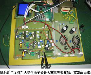 作品介绍:本系统利用前级放大电路、LC低通滤波电路、后级功率放大电路、峰值检测模块及单片机显示控制这五个主要模块,完成了一个5V单电源供电,通频带7MHz和15MHz可预置,增益44dB,在负载50Ω情况下输出峰峰值最大10.8V的宽带放大器。