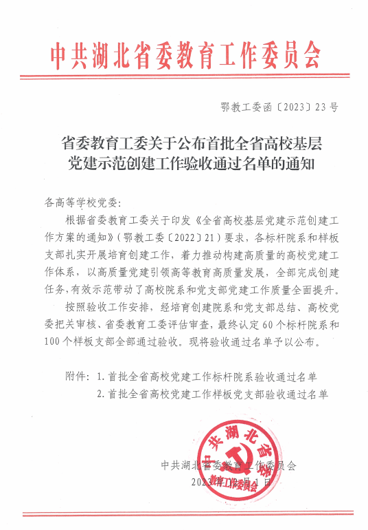 (记者 祝琳 报道)中共湖北省委教育工作委员会公布首批全省高校基层党建示范创建工作验收通过名单,OK138太阳集团学工第三党支部通过首批全省高校党建工作样板党支部验收。