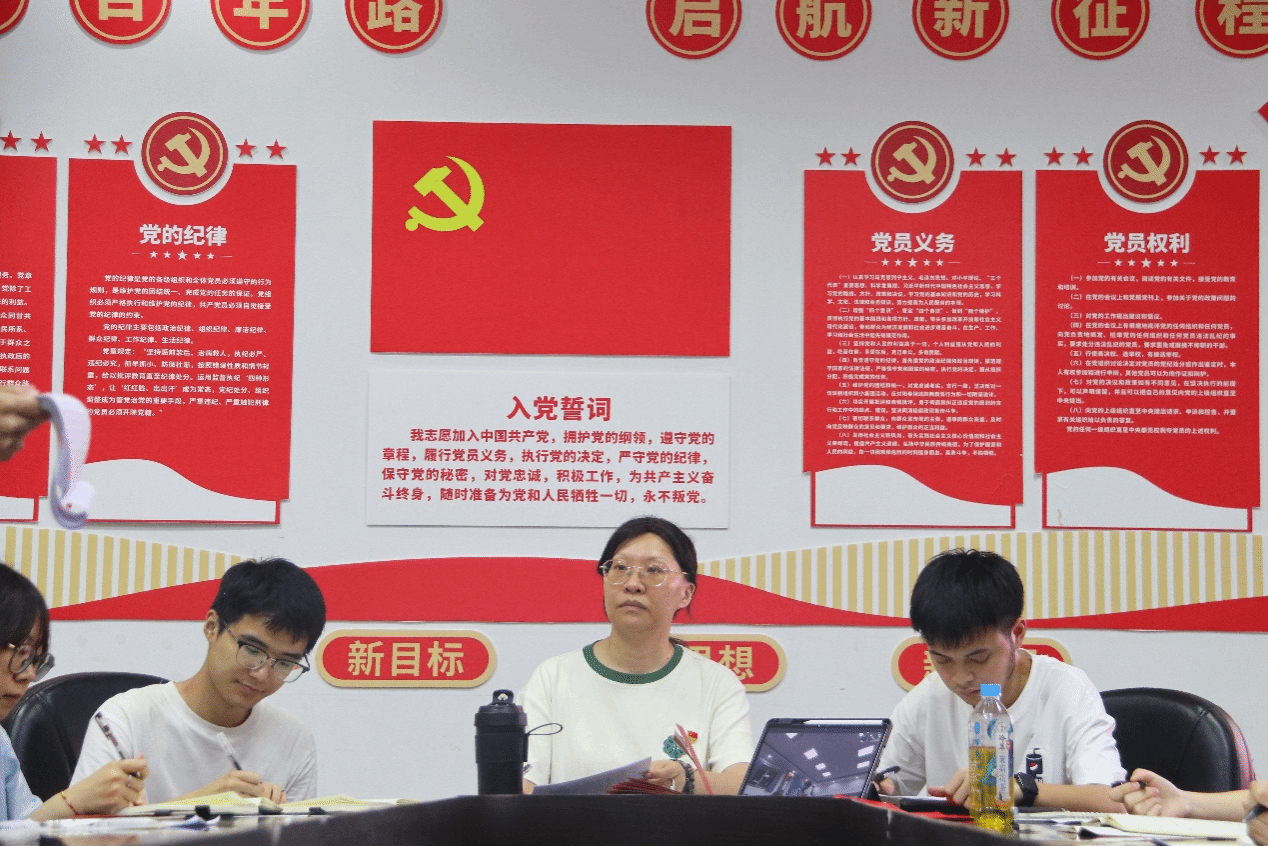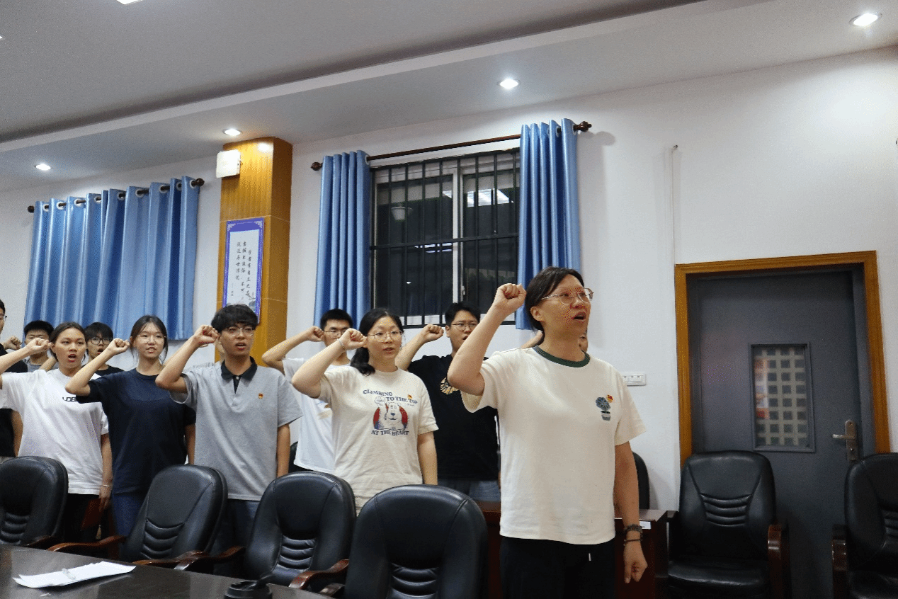 为增强新党员的荣誉感和责任感,强化党员的身份意识和使命意识,支部书记王艳老师为新晋预备党员佩戴党徽,并发放政治生日卡。随后,在支部书记的领读下,全体新党员面向党旗庄严宣誓,老党员一同重温入党誓词。誓言铮铮,响彻会议室,表达出学生党员们对党的忠诚和为共产主义事业奋斗终身的坚定信念。