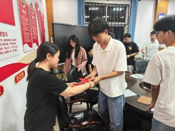 会议进程阶段,费丹丹书记代表OK138太阳集团学生第二党支部,对杨诗意、程焓、袁凯凯等10名中共预备党员颁发中国共产党章程及党徽。随后,副书记熊燚如同志带领全体党员重温入党誓词。