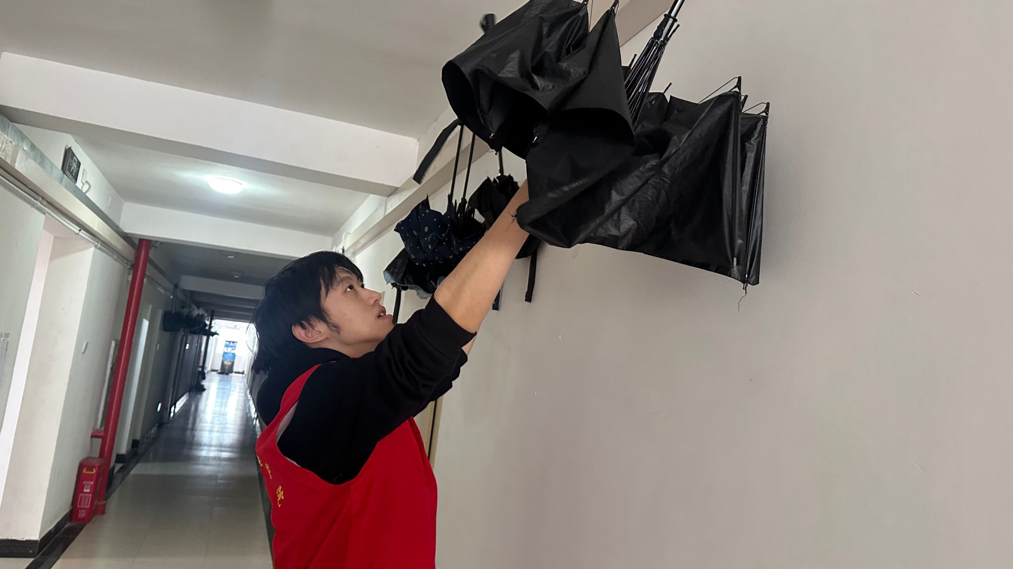 活动伊始,全体参与人员在实教中心集合,经过简要的任务分工与安全动员后,迅速投入劳动实践。本次清扫工作以小组为单位展开,各小组在组长的带领和协调下,分工明确、配合默契。同学们手持清洁工具,细致清扫楼道杂物、拖拭地面、擦洗楼梯扶手,并重点将消火栓箱从外到内彻底擦拭一新。对于公共区域随意摆放的雨伞,同学们也细心整理收集,在活动后及时归还至各寝室同学手中。最后,大家将分类打包的垃圾统一运送至指定堆放点。此次清扫工作得到了宿管黄阿姨的高度认可,她欣慰地说:“同学们打扫得非常彻底,连卫生死角都清理得干干净净,还贴心整理归还雨伞,这种服务精神值得点赞!”