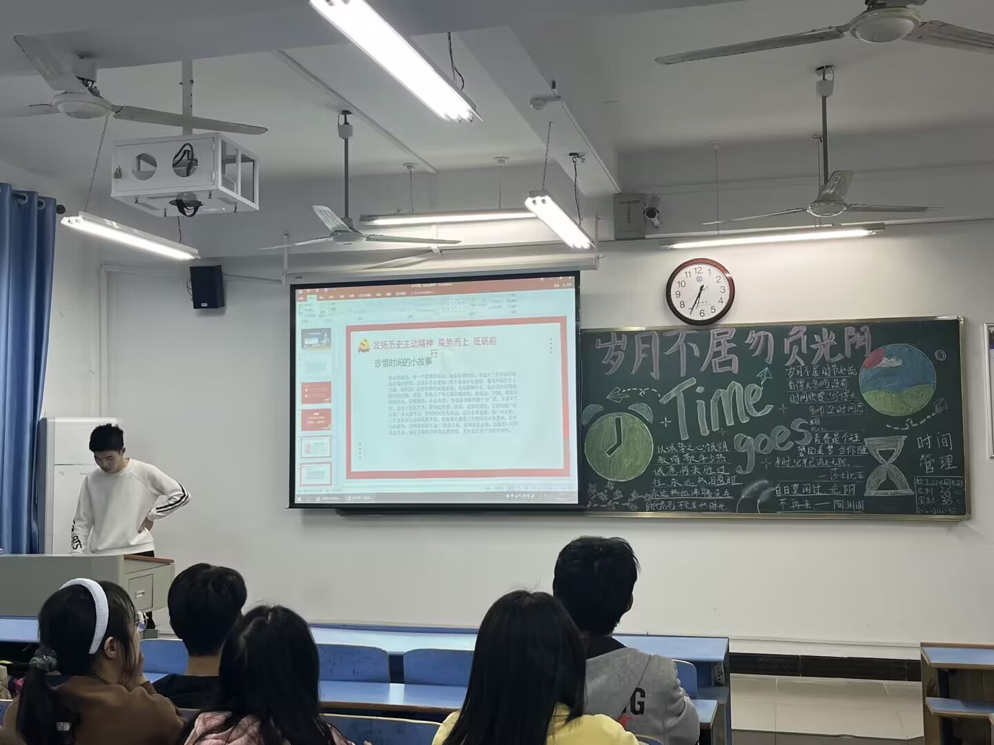 据悉,本次活动由各班团支书组织开展,团支书带领各班宣传委员、组织委员从“不负光阴”展开对于岁月的讨论。有些同学们表示面对匆匆流逝的时光,总会感到眩晕般的恐惧,也有手足无措的茫然,但也有的同学说到既然留不住过去,也可以将现在好好把握。通过主讲人就“不负光阴”为核心,让同学们踊跃发言,去探讨这样才算是不付时光。既然留不住时光,但可以让每一天都过得充实起来最后,同学们还在主讲人的带领下让他们说出自己的想法,使学生认识到时间的重要性,把握当下,为未来创造机会,把日子过的充实而不是失乐趣,紧紧把握住每一寸时间。主讲人引导广大学生要对时间有着清晰的认知,给同学们讲解了时光的重要性,同时告诉同学们要珍惜时间,不要去一味的感慨时间的稍众流逝,要付诸行动去把握时间。一句箴言说得好,“珍惜时间的秘诀在于,少说空话,多做工作。”若以此态度做事,则功业可就。总之,盛世不重来,一时难再晨,及时当勉励,岁月不待人。