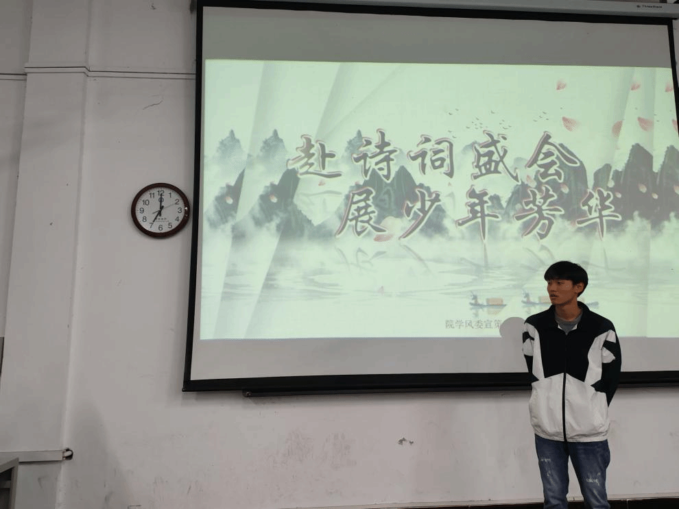 此次活动共分为两轮比赛进行,比赛进行第一轮:主持人提上句,参赛者回答下句,八秒内未答出则视为失败,每个人有两次错误机会。工作人员会根据参赛人员回答的题目数量来为参赛选手评分。第一轮赛程结束后,选手们经过短暂的休息开始了第二轮的比赛。第二轮比赛根据第一轮选手的情况安排选手两两上台抢答问题。共三个问题,先回答对两个问题的选手晋级。在参赛选手们激烈的比赛过后,共有16名同学从初赛中晋级。赛程中,每一位现场同学都积极配合这次活动。台下的同学以热烈的掌声表达对参赛者的鼓励,参赛的同学则以自信回答问题的嘹亮声音回应场下的同学。