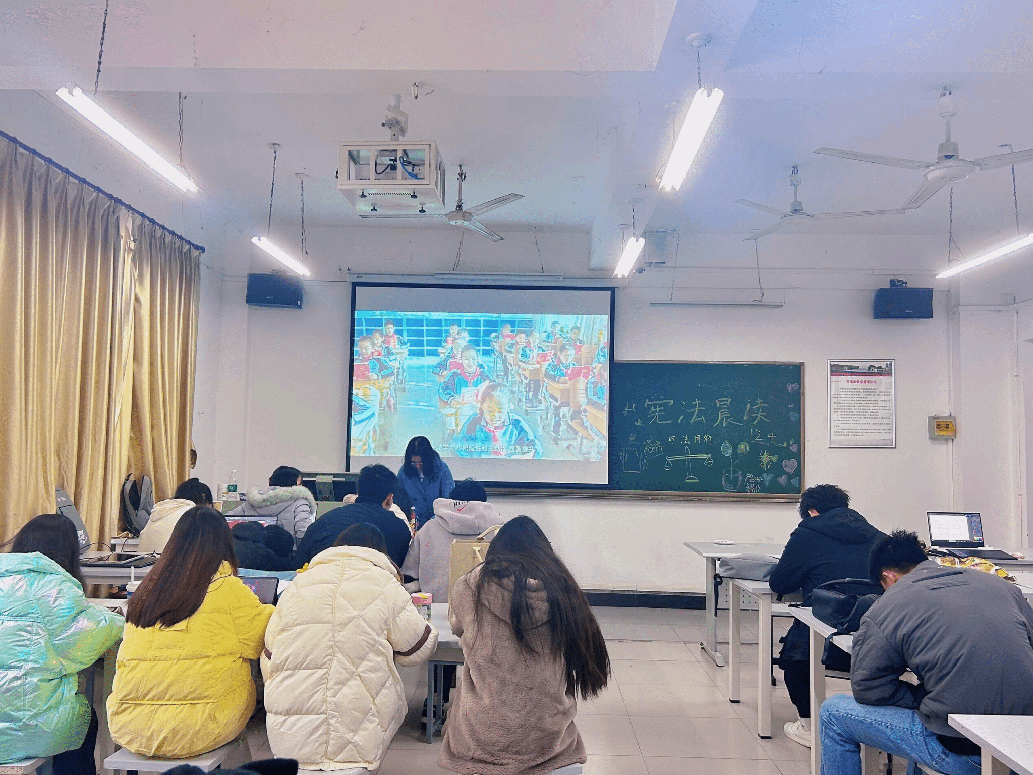直播结束后,学院迅速组织了学生进行晨读,让同学们继续学习宪法的精神,深化对宪法的理解,晚间则开展了歌唱学习,以便大家深入了解和感受宪法的力量。