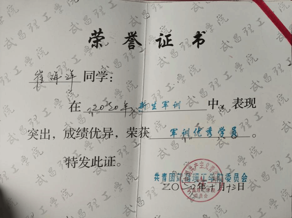 崔海洋自入学以来便以高度的自律和勤奋的态度投身与学习,他深知,只有通过不懈的努力和积累,才能在知识的海洋中乘风破浪。因此,无论是课堂学习还是课后自习,他都严格要求自己,不放过任何一个学习的机会。正是这种刻苦的精神,使他在学业上取得了优异的成绩,多次获得奖学金和优秀学生的称号。他不仅在学习上刻苦钻研,成绩优异,更是在军训中展现出非凡的毅力和品质,被评为军训优秀学员。