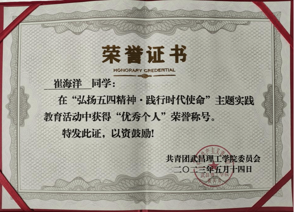 除此之外崔海洋还作为队长带领实践团队获得过“千校千项”、“镜头下的三下乡”等国家级奖项,团中央“优秀社会实践团队”、团省委“社会实践优秀个人”、“笃行计划”全国示范团队等荣誉称号,在2023年五月十四日“弘扬五四精神•践行时代使命”主题实践教育活动中获得“优秀个人”,先后荣获2021-2022学年度“五四表彰”中,“优秀团干荣誉称号”等。
