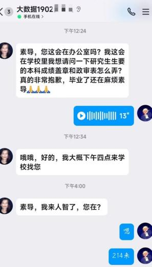 3月28日凌晨2点54分,西八21级计网专业一名女生小飞(化名)急发肠胃炎,小飞担心打扰到素导老师休息,准备自己叫车前往医院,楼管阿姨建议小飞和素导联系告知情况。凌晨3点8分,小飞拨打了值班素导平博文老师电话,拨出仅一秒钟平老师就接通了电话。得知情况后,平老师迅速起床穿着短袖拿着伞,冒着风雨一路奔跑到西八,平老师三步并五步,前后不到五分钟时间。