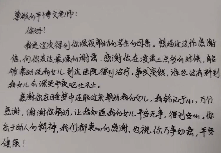 平老师安顿好小飞,已是4点48分。当天上午,小飞家长写了一封感谢发给学院,特别感谢平老师对学生的快速反应和尽职尽责。在信中,小飞家长写道:“感谢您能及时送孩子前往医院得到治疗,我们衷心的感谢。”