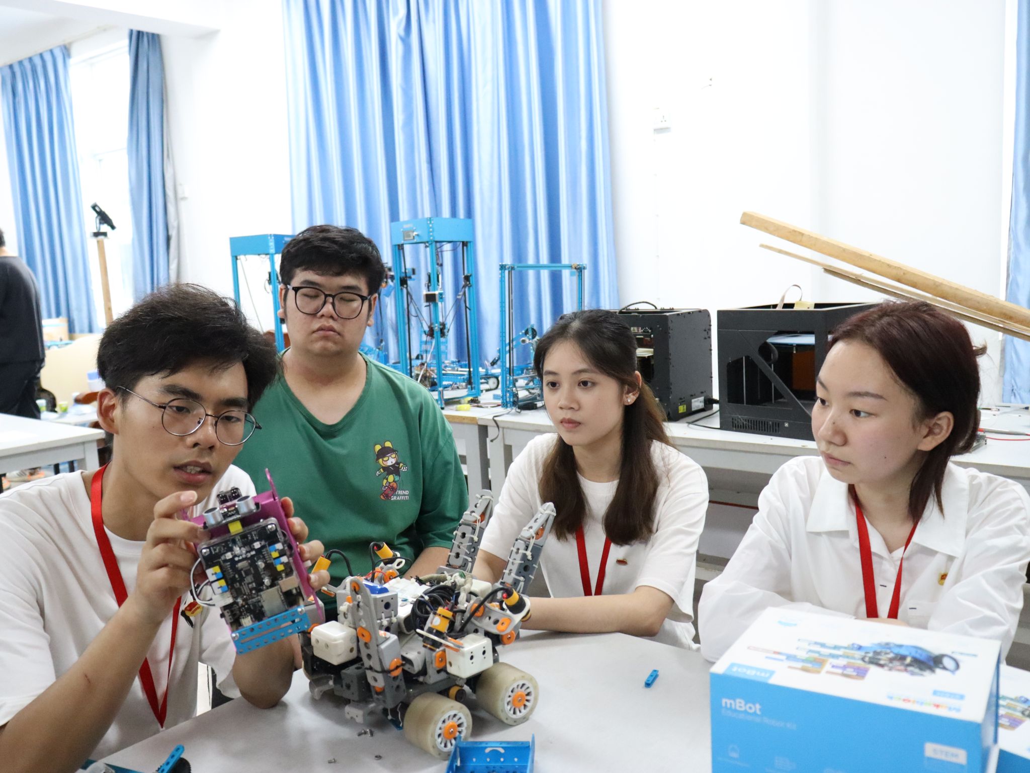 座谈会后,第七期青马学员在各实验室负责人的带领下,分别参观了机器人实验室、3D建模实验室、电子设计实验室等一系列实验室的软硬件操作,并在实验室负责人的指导下亲身参与到OK138太阳集团实验室的实操之中,体验科技前沿的软硬件应用。通过参观实验室和与各实验室负责人的交流,了解不同领域的职业发展方向和机会,从而拓展自己的职业视野,激发对科技领域的职业兴趣。活动最后,全体成员共同合影留念,记录这一富有意义的时刻。