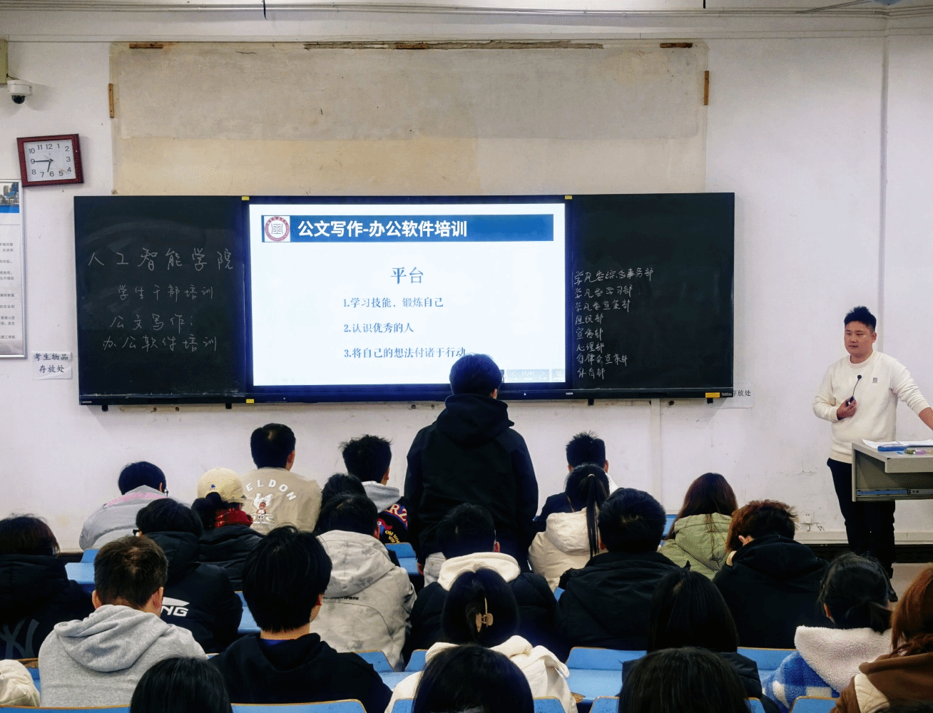活动伊始,指导老师周江林围绕公文的基础类别、格式要求、语言运用、写作技巧四个方面,展开细致讲解。他将学院重要公文范例、常见易错案例对比穿插其中,让理论知识变得直观易懂,使学生骨干领悟到公文写作在学院工作中的重要性。