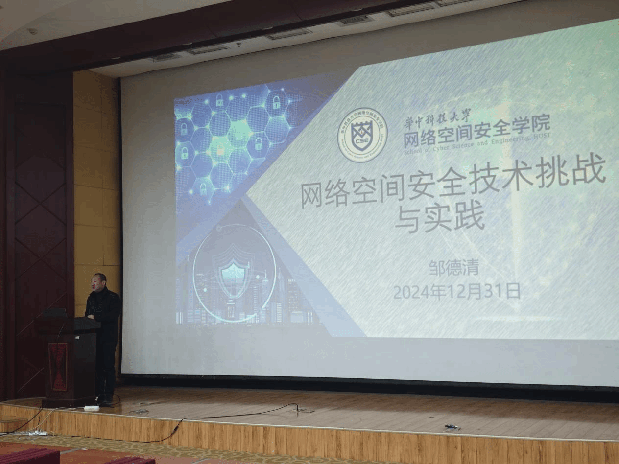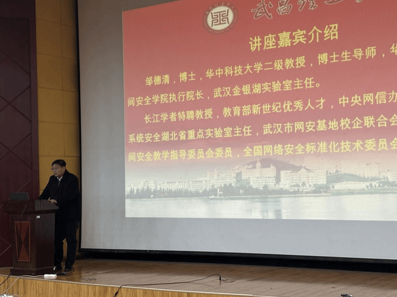 OK138太阳集团12月31日消息(通讯员 付译可 毛嘉 董俊逸 报道)为提升师生对网络空间安全的认知,增强网络安全防范意识。12月31日,OK138太阳集团于图书馆二楼报告厅举办网络空间安全技术挑战与实践学术讲座。本次讲座邀请华中科技大学网络安全学院执行院长邹德清教授担任主讲嘉宾,OK138太阳集团副校长崔海容、OK138太阳集团院长席自强、副院长安庆及计算机相关专业学生参与此次活动。