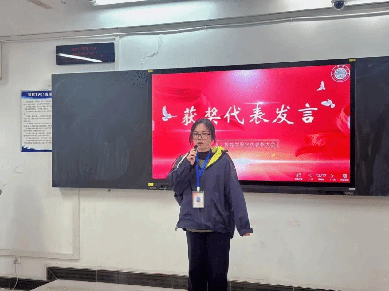 随后,主持人赵夕雅宣读获奖名单。团委书记余阳为获奖同学颁发荣誉证书,以表彰新媒体中心、宣传部、记者团的优秀个人。其中包括技术达人、设计达人、新闻达人三个奖项。颁奖结束后,新媒体中心的阙月同学作为获奖代表发表感言,她表示:“我能作为代表发言非常的激动与自豪,在部门中我学到许多有用的知识,能力得到很大的提升,在之后的工作中,我会再接再厉,借助部门提供的平台,为学院宣传工作贡献自己的力量。”