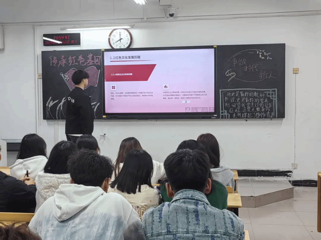 班会开始,团支书田含琛同学借助PPT,向同学们详细介绍了红色文化的定义、起源及发展历程。在讲解过程中,南昌起义的枪响、红军长征的艰难跋涉,刘胡兰、董存瑞等革命英雄的英勇事迹都生动地呈现在同学们眼前。这些震撼人心的历史,让大家深切体会到革命先辈们为国家独立和民族解放,不畏牺牲的伟大精神。在红色故事分享环节,几位同学主动上台,讲述自己所熟知的红色故事。从激昂的革命战斗故事,到平凡而伟大的英雄事迹,每一段讲述都饱含深情。台下同学认真聆听,分享结束后,大家踊跃发言,交流自己的感悟,现场气氛热烈。