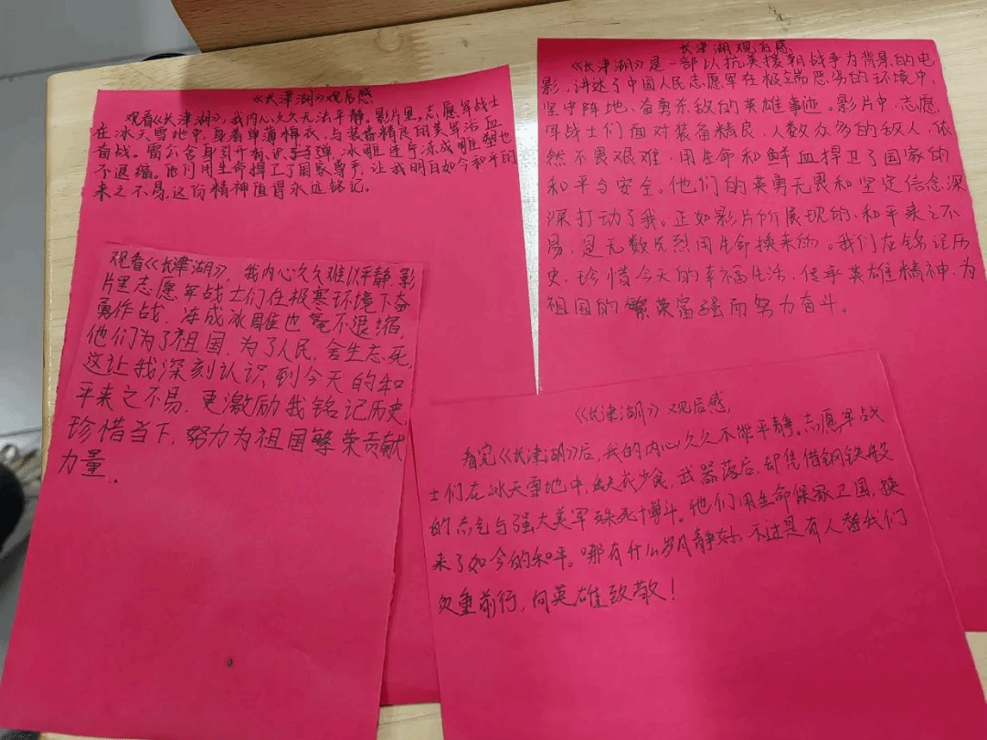 为检验同学们对红色文化知识的掌握程度,班会还设置知识问答环节。主持人提出一系列与红色文化相关的问题,涵盖历史事件的时间、地点、人物,以及革命精神的内涵等。同学们纷纷举手抢答,展现出扎实的知识储备和对红色文化的浓厚兴趣。在此次活动中,同学们还共同观看红色电影《长津湖》。影片中志愿军战士在极端恶劣的环境下,不畏强敌、浴血奋战的场景,深深触动每一位同学的心灵。观影结束后,同学们梳理思路,撰写观后感。几位同学上台分享自己的感悟,表达对革命先辈的崇高敬意,以及努力学习,报效祖国的决心。