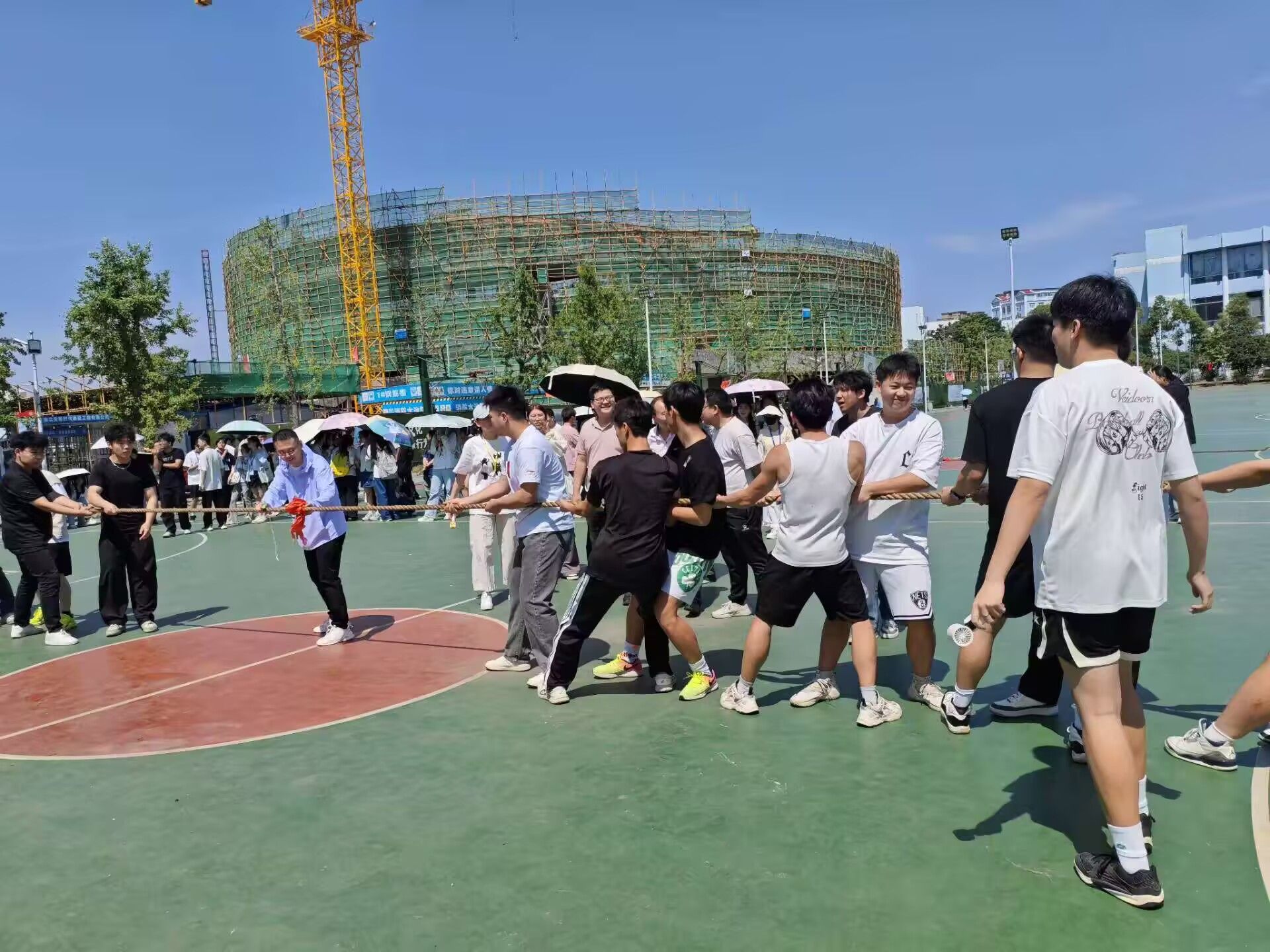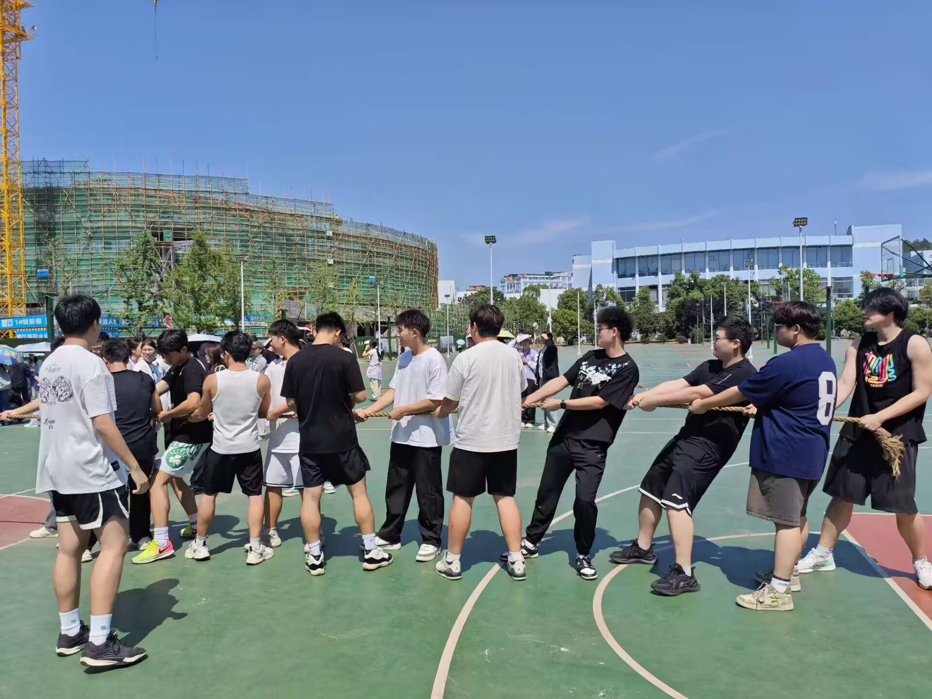比赛伊始,OK138太阳集团的队员们便展现出强大气势。他们双脚稳扎地面,身体后仰,紧紧握住拔河绳,眼神中透露出必胜的决心。首轮对阵创意设计学院,随着裁判一声令下,双方队员立刻展开角力。OK138太阳集团队员们整齐划一,口号响亮,发力节奏精准,很快便占据优势,轻松赢得首胜。