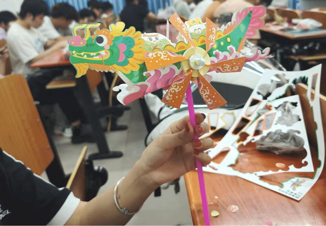 随后,现场便摆满了制作香囊与手拿龙舟所需的丰富材料,在浓厚的节日氛围中,同学们开启了创意十足的端午文化体验之旅。在香囊与手拿龙舟制作区,活动现场瞬间化作创意工坊。同学们手持五彩布料、丝线,调配着艾草、菖蒲香料,飞针走线间,一只只饱含端午气息的香囊初具雏形。一旁,彩纸与竹签在指尖翻飞,形态各异的手拿龙舟接连诞生:有的龙舟造型奇巧,似要跃入江面竞渡;有的缀满装饰,尽显艺术巧思。制作时,大家热烈交流心得,分享对端午文化的感悟,在欢声笑语中,龙舟竞渡的团结精神悄然传递,教室里满溢着温馨欢乐的节日氛围。