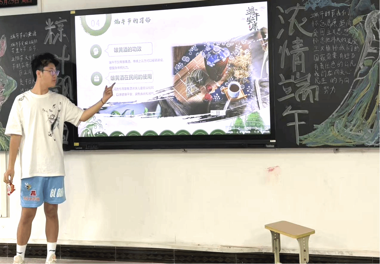 活动伊始,主持人王一安为同学们介绍端午节文化内涵。他提到,端午节作为中国四大传统节日之一,起源于上古祭龙仪式,承载祈愿风调雨顺之意,包粽子、赛龙舟等习俗与纪念屈原相关;插艾草、菖蒲可驱虫辟邪,佩香囊寓意祈福安康,系五色丝线象征驱灾除灾,彰显深厚文化底蕴。