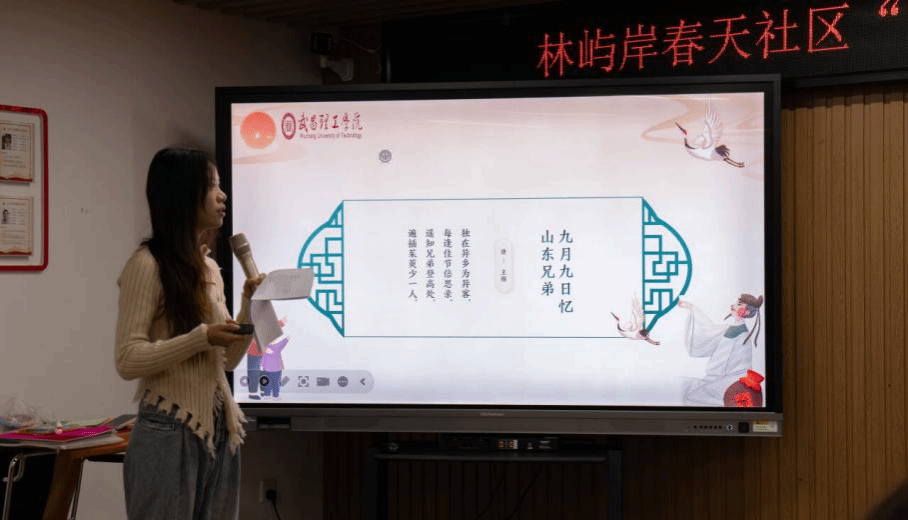 活动中,志愿者化身“传统文化传播者”,结合专业优势与青春热情,为小朋友们带来生动的重阳知识课堂。主讲人蔡心怡从重阳节的起源讲起,详细介绍了登高、赏菊、放纸鸢、祭祖等传统习俗,并深入解读习俗背后的文化寓意——“佩插茱萸”寄寓抵御初寒的美好愿望,“饮菊花酒”承载延年益寿的传统期盼。鲜活的讲解让小朋友们对重阳节的文化内涵有了更深刻的理解,也激发了他们对传统文化的兴趣。