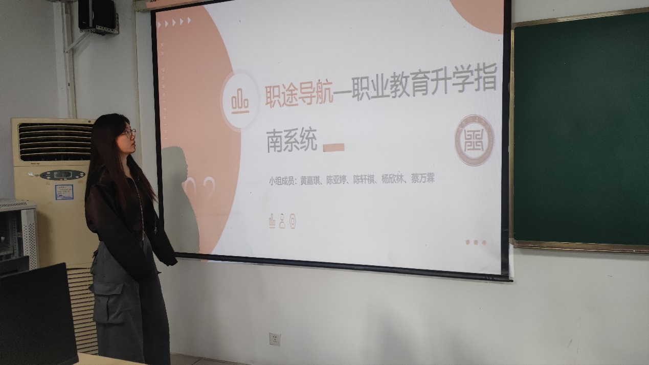 赛场上,每个小组的组长精彩地介绍了自己的项目,如“职途导航—职业教育升学指南系统”项目的组长在介绍时说明了小组选择这个项目的原因,也阐述了该项目的实现原理。