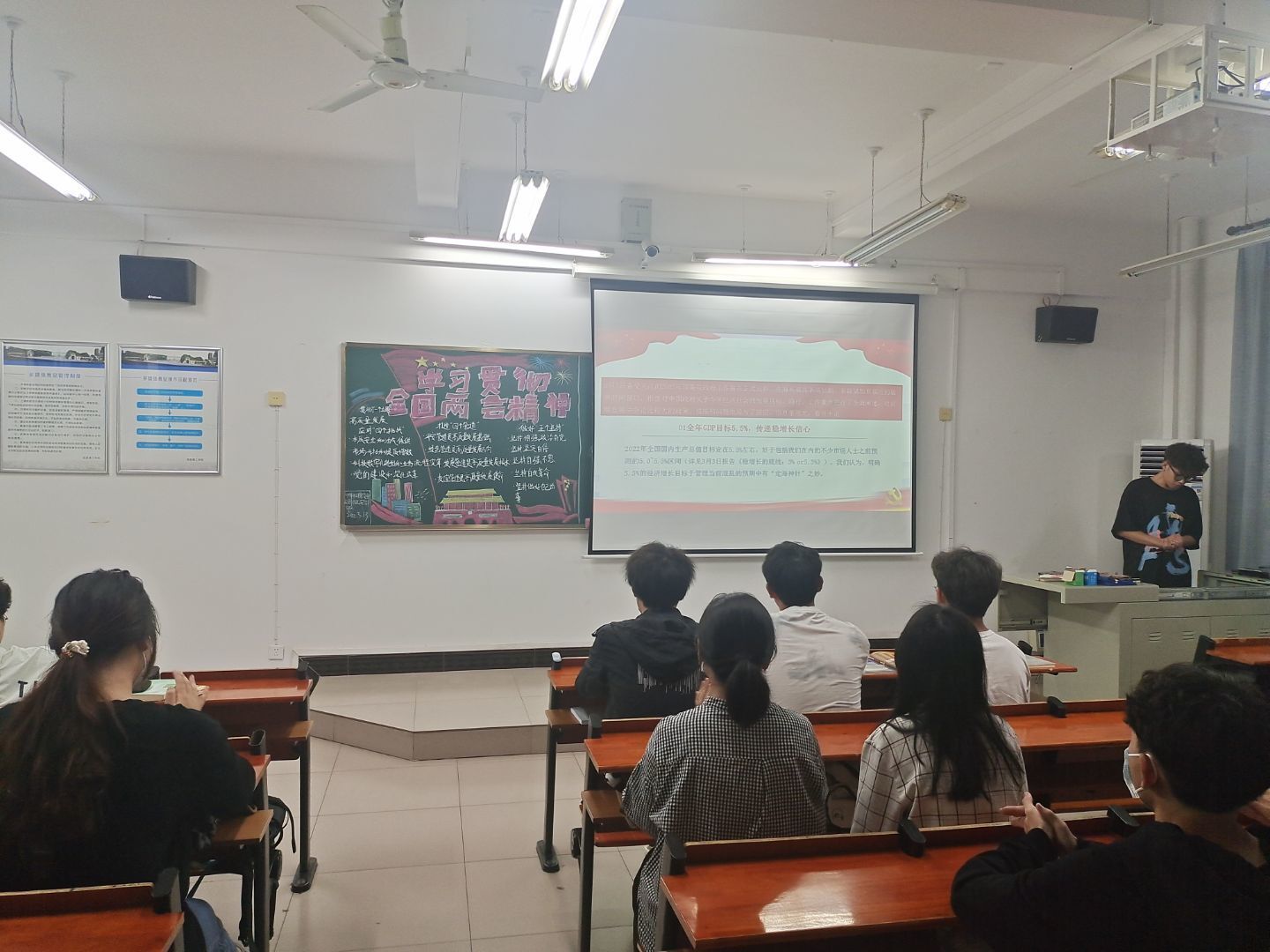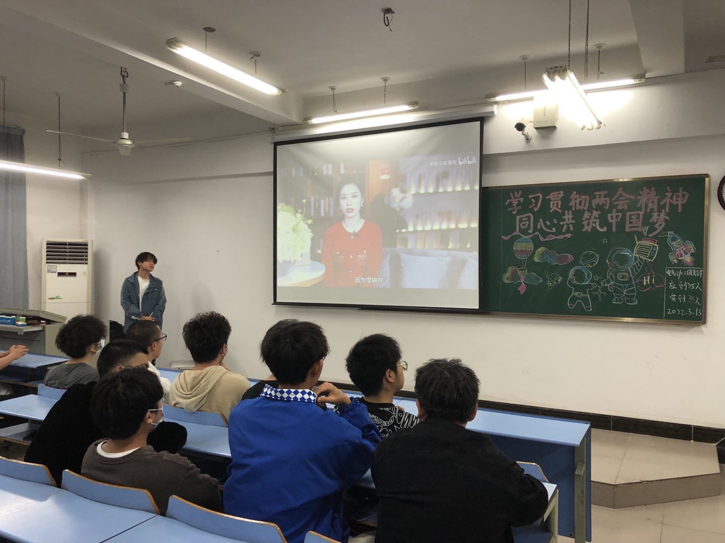 据悉,此次班会由各班团支书主持召开。班会前,团支书带领组织委员、宣传委员及生实委员提前进入教室,打开PPT、绘制板报及打扫教室卫生。班会伊始,各班团支书带领同学们了解近年来国家面临复杂严峻国内外形势和国家所取成就。与此同时,同学们纷纷举手表达自己对国家现状认识。紧接着,团支书带领同学们学习有关两会精神。团支书播放两会相关视频,让同学们深入学习两会精神与中国梦。同时,团支书带领同学们讨论如何弘扬两会精神与如何以实际行动共筑中国梦,学生纷纷表达自己对此次班会的深入认识与今后学习目标。最后,各班团支书进行总结:“我们通过此次班会学习两会精神,让我们深入了解中国梦内涵。我们要刻苦学习,时刻心系国家时局,要为实现富强民主文明和谐美丽社会主义现代化强国奋斗,要高举中国特色社会主义伟大旗帜,坚定心中理想目标,砥砺前行。”至此,本次班会落下帷幕。