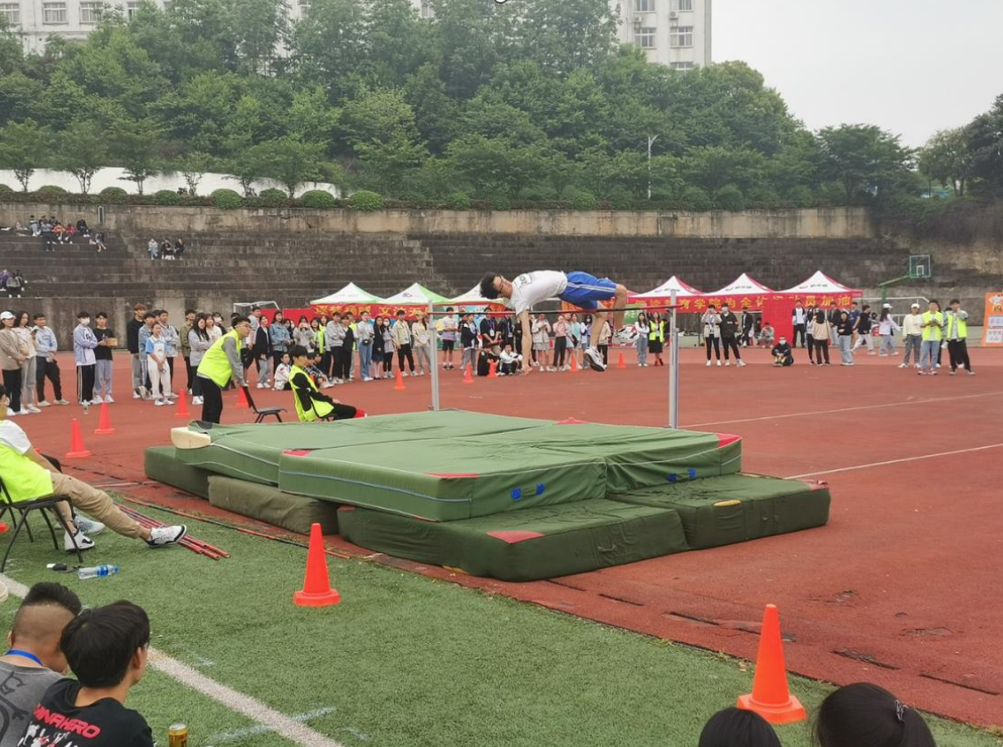 按照比赛规则,每个运动员有三次机会,最终取最高成绩。比赛开始,裁判员指挥旗挥下,运动员们依次登场。比赛过程中,2015号运动员钱泰的精彩表现吸引了观众眼球,只见他身体前倾,双腿微曲,以百米冲刺的速度向前冲,在横杆前,他双腿用力将重心转移至腰间,仰身以背越式跃向横杆,动作十分流畅。竹竿的高度不断地被抬升,钱泰也慢慢抗住压力不断地个人成绩。最终,在决赛1.68米前,钱泰与他的竞争对手已经接连失败两次了。第三跳对手先跳失败后。钱泰尝试两次后,顶住压力,一跃而起,在空中划过一道弧线,成功越过栏杆。夺得本次运动会男子跳高冠军。