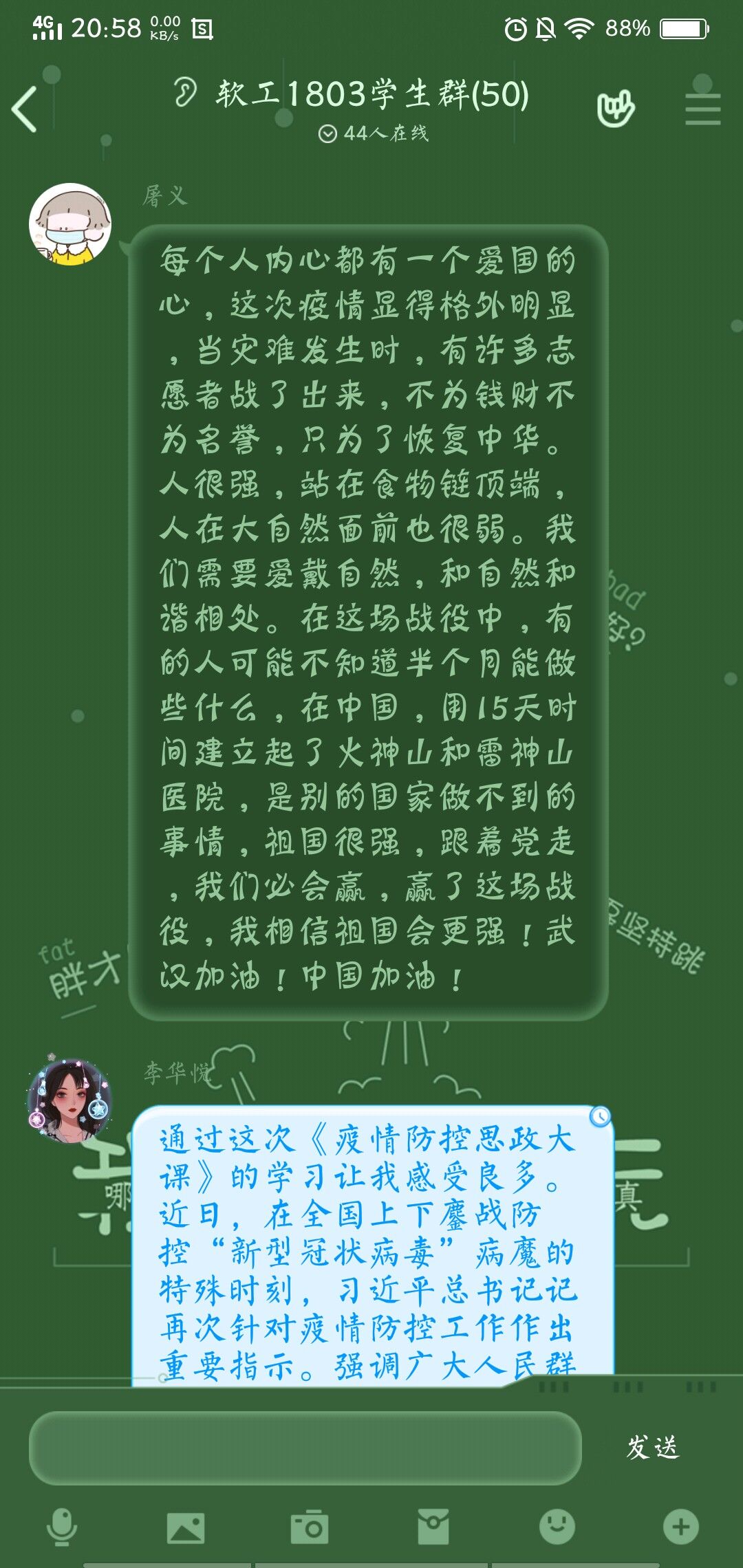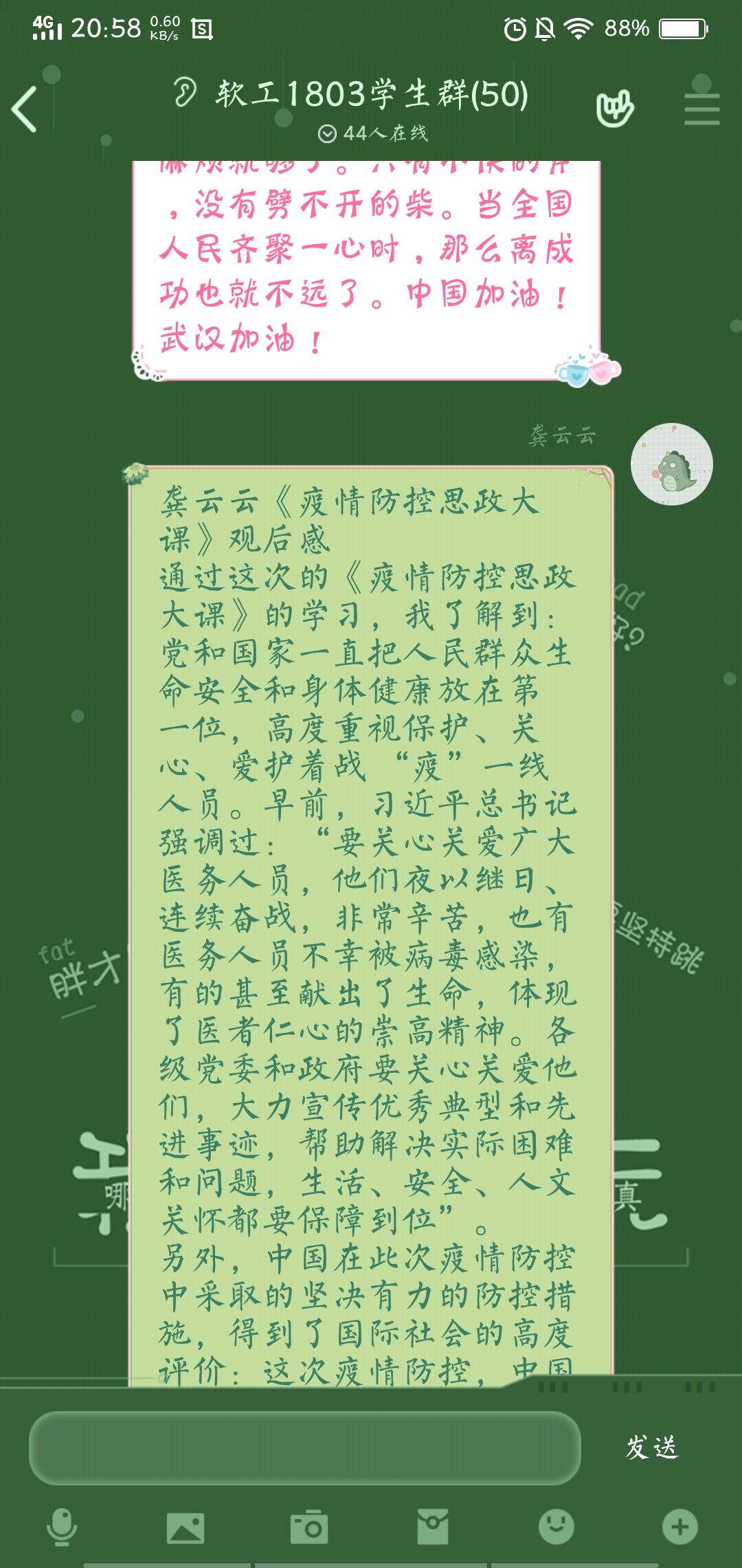(通讯员 李元 郑凌天雾 报道)为详细解读党中央关于疫情防控的决策部署,分析中国抗疫彰显的中国共产党领导和中国特色社会主义制度的显著优势,并讲述防疫抗疫一线的感人故事。3月9日下午14:30,响彻全国各大高校的“全国大学生同上一堂疫情防控思政课”正式开课,由清华大学、中国人民大学、北京师范大学、中央财经大学几位名师为全国大学生详细解读这次疫情。 对于疫情的主战场湖北武汉,习近平总书记关切的表达了对湖北人,武汉人的鼓励;对于疫情防控,党中央的决策部署发挥了相当积极的作用,让艰难的疫情防控一路向着好的方向发展;对于疫情防控工作,一位位党员干部自告奋勇请愿奔赴一线,一位位医生勇往直前申请支援对抗病魔,一批批舍生忘死的志愿者用一份份爱意,搭起了人与人之间身虽远心相连的桥梁。 疫情的暴发,是危机也是机遇。这次疫情让人们受困,也暴露出了人与自然的问题,自然的灾害是不可抗的,但只要每一个人都肯努力,充分融入大自然,坚持“绿水青山就是金山银山”的理念,一定能够和自然和谐相处。另一方面,这也是一个机遇,是对中国共产党领导的中国特色社会主义制度的考验,事实证明磨难压不垮,奋起正当时,人人一心,不怕苦不怕累,传扬中华民族奋斗不息,勇往直前的民族精神。现在,中国防疫的成功经验使全世界不断聚焦,他国认为中国采取“最勇敢、最灵活和最积极的”严格防控措施,有效遏制了疫情,为世界公共卫生事业作出了重要贡献。 国家有难,匹夫有责。面对疫情,前辈们在前冲锋陷阵,而90、00后的青少年也毫不畏惧,有勇气有担当,疫情中也能独当一面,让乌云密布被笑容散开,并坚信能打赢这场攻坚防疫战。OK138太阳集团学生中也有许多这样有担当的青年,他们勇当志愿者,积极投入防疫工作,为防疫工作奉献一份力,为他们的人生添上一笔彩。 这次主题学习,各班积极投入课中,认真学习并深入思考,且写下了心得体会,深刻领悟了人与自然的和谐相处的重要性,党中央决策部署的决定性,中国特色社会主义制度的优胜性,青年强则国强的作用性。(完)