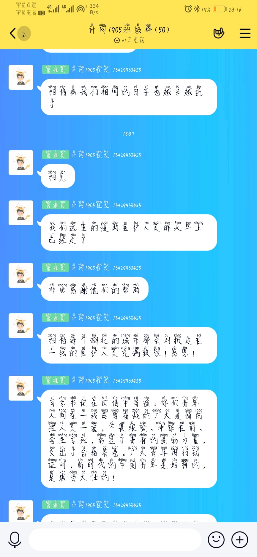 虽身处异地,但对本次话题的讨论热情丝毫不减,比如软工1902班就在QQ群中表达了许许多多对于此次防疫的看法,记者采访到夏鹏飞同学,说“我们作为新时代大学生,更要勇敢站出来,将小我融入到大我,为打赢这场疫情阻击战贡献自己的一份力量。同时也要做到科学防护,做到不忘学习,不忘责任,合理安排时间,提升自我,不负韶华。”疫情当前,一群90后,00后们扛起了前辈们的担子,褪下了曾经青涩的外衣,这一次疫情,彰显的是中华民族的不畏风雨,勇往直前的勇气与担当。