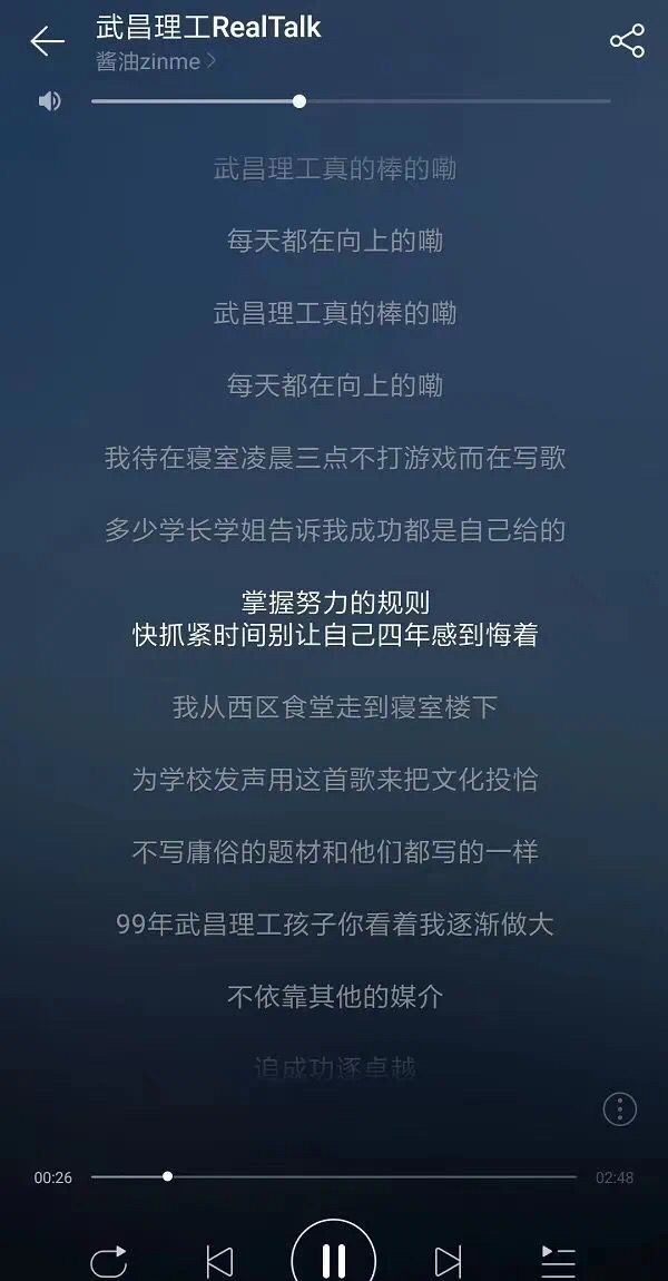 “嗨,武昌理工真的棒的勒”在悠扬的歌曲之中词词句句体现着张佳明对OK138太阳集团的喜爱,歌词中的每一句都唱出了武昌理工的日常生活,流露出了他对校园生活的热爱之情。据了解,这首歌原创人分了三部分来写。第一部分主要是表达一个字-梦,就是我们所追寻的梦,人生的风向标于目的。第二部分则深入渗透到校园生活,细致入微,有温柔贴切的宿管阿姨,有叫打球的球友,有食堂的饭菜等,是校园生活的真实写照。最后一部分则跨上另一台阶,展示自己的人生态度,自己对很多事情的看法,表达出做任何事只要肯努力,梦想绝不会是远方。