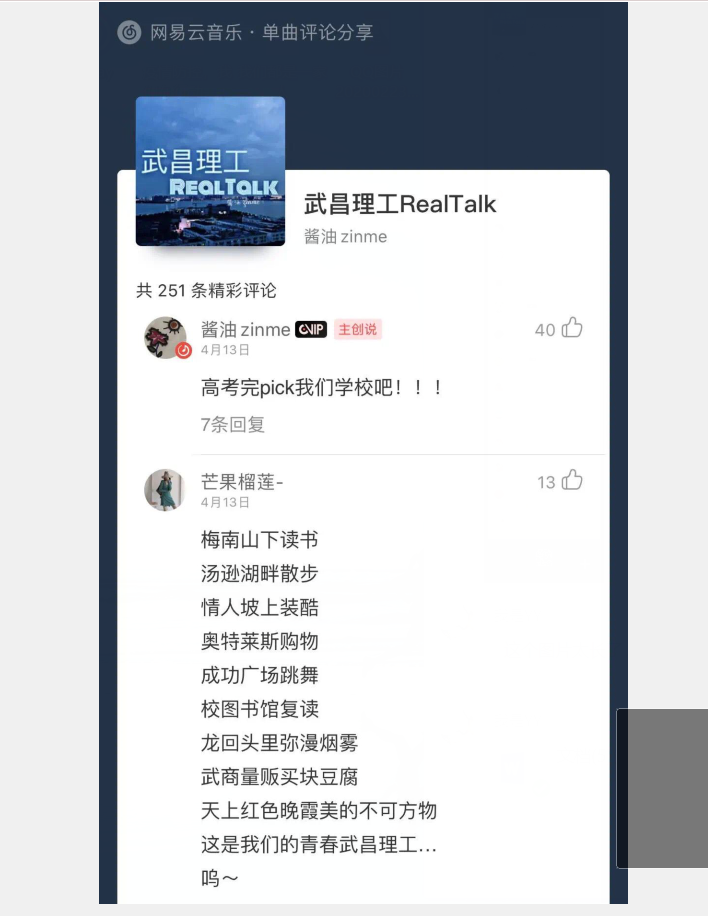 这一首歌唱出的不仅仅只是他一个人的心声,也是万千武昌理工人的心声,每一个武昌理工人也在祝福着想念着那一个坐落于梅南山下汤逊湖畔的美丽家园。樱花在开了,我们也该回“家”了。