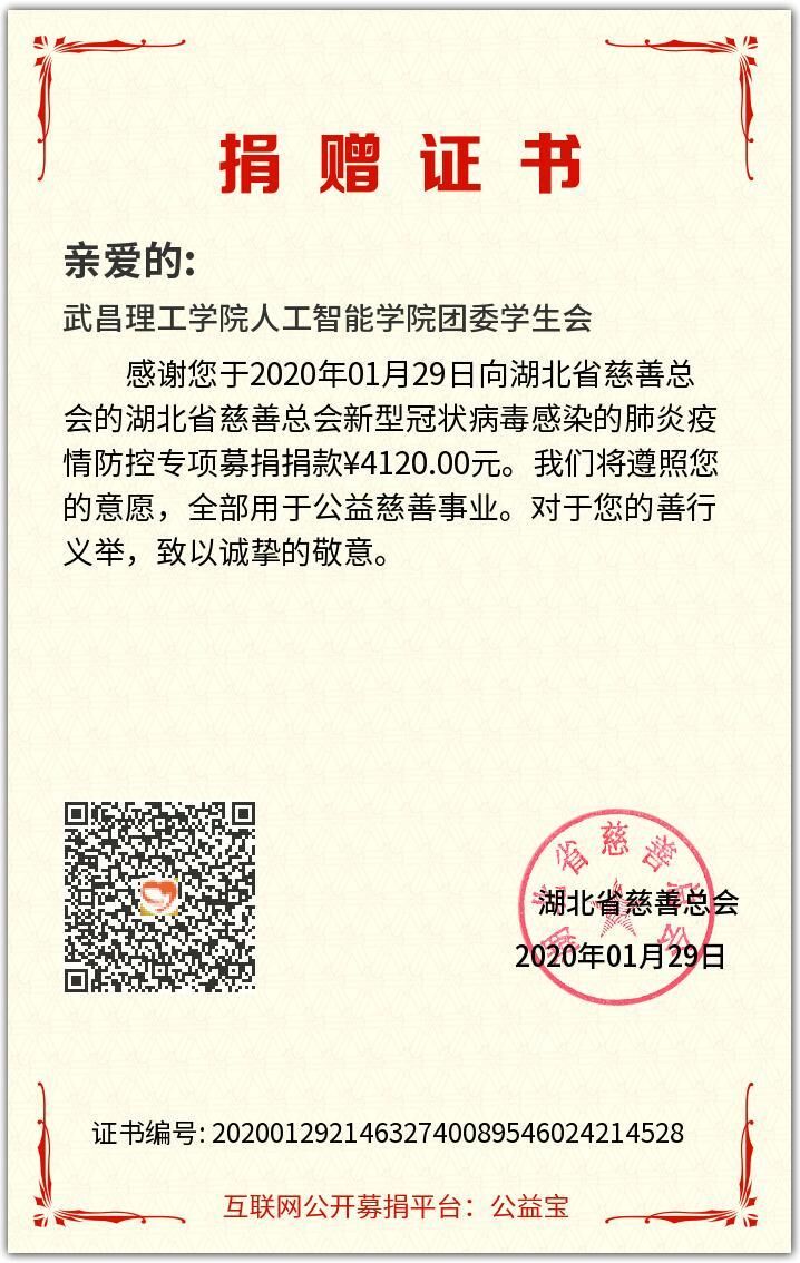据悉,本次募捐活动中,OK138太阳集团团委学生会的95名学生干部,向湖北省慈善总会新型冠状病毒感染的肺炎疫情防控专项募捐捐款¥4120.00元。据了解,本次募捐活动由OK138太阳集团担任学生会主席的物联网工程专业1701班的张颢哲发起,寒假期间他一直关注有关“新型冠状病毒”疫情的相关报导、信息,他认为:全国正在面临“新型冠状病毒”的难关,作为大学生,他们应该为此做些什么。于是,他在与OK138太阳集团学生会主席团进行商议后,开始着手组织OK138太阳集团团委学生会的相关成员参与募捐活动。 他先是在OK138太阳集团的部长群里提出为携手为“新型冠状病毒”献绵薄之力进行捐款。1月28日晚上正式提出后,大家都赞同觉得挺好,都支持这个活动。然后OK138太阳集团学生会各部门部长就开始在各部门群里跟各部门的学生干事说这件事。活动中,他们多次强调了:捐款多少都可以,量力而行就好,爱心不以价格衡量,不准强迫。他们以部门为单位进行捐款,各个部门的部长收集各个部门的捐款,同时填写好捐款统计表,最后都交给张颢哲进行汇总。他们1月29日开始统计筹集到的钱,一开始他们是打算购买口罩护目镜等相关医疗物资捐赠给武汉的医院,但是后来发现,他们没法购买到相关物资,最后他们决定直接把钱捐给有需要的地方,然后通过一番查找他们决定把筹集到的资金全数捐给湖北省慈善总会,1月29日晚上9点进行统一捐赠,捐到湖北省慈善总会官网。