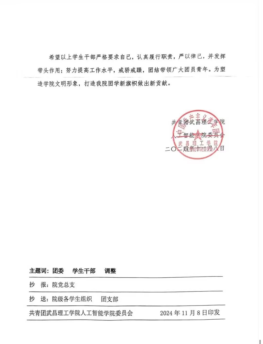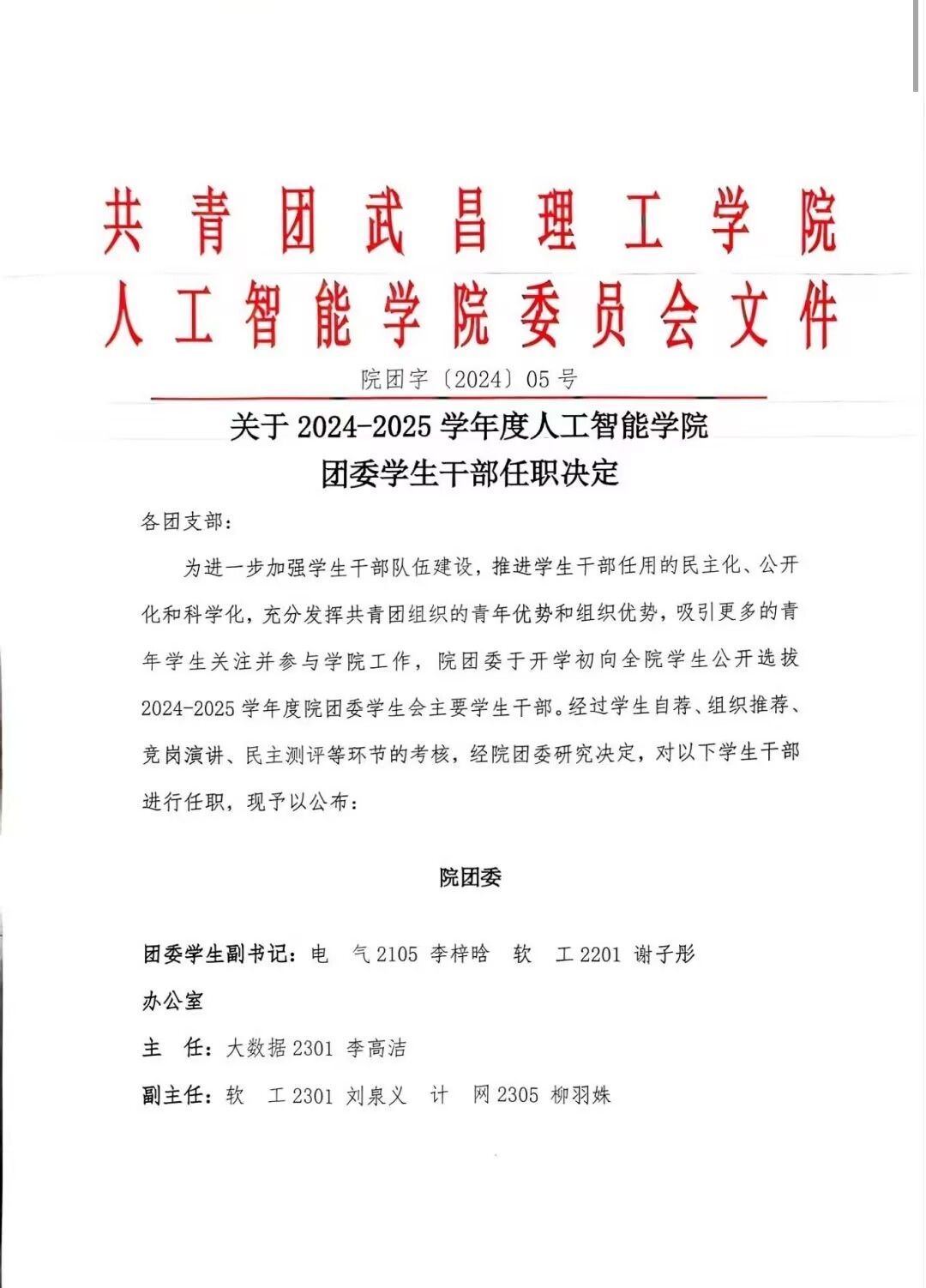 2024-2025学年度OK138太阳集团团委学生干部任职决定