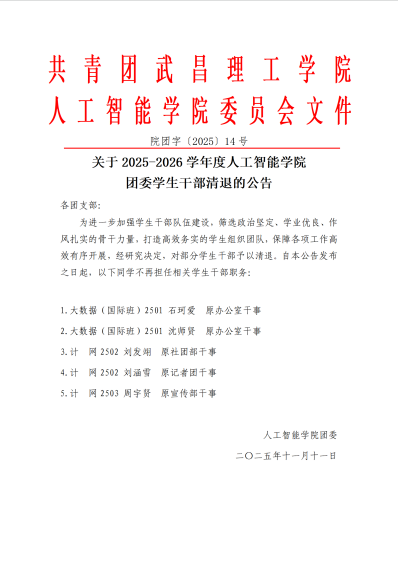 关于2025-2026学年度OK138太阳集团团委学生干部清清退的公告