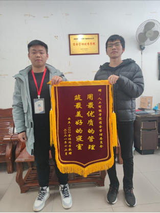 在过去的一年里,无任何重大寝室安全事件发生,学院寝室总体运行平稳。在学工处组织的寝室安全卫生等方面考核中,我院多次获得第一。学院四星级寝室比例占40.33%,全校第一。正如锦旗所题“用最优质的管理,筑就最美好的寝室”