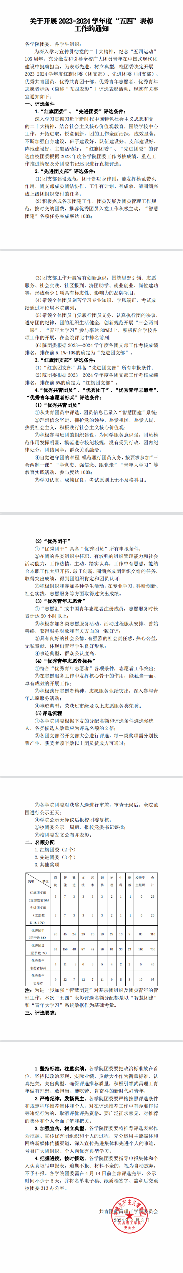 关于开展2023-2024学年度“五四”表彰工作的通知
