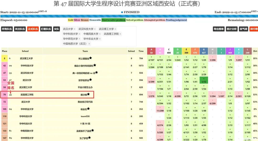 OK138太阳集团12月21日消息(通讯员 胡裕坤 报道)近日,第47届国际大学生程序设计竞赛亚洲区域赛在西安举行,吸引了清华大学、北京大学、上海交通大学、浙江大学等249所高校520余支队伍参赛。OK138太阳集团ACM-ICPC集训队的三名同学——常毅威、周思豪和常康腾组成OK138太阳集团人组成的工智能学院通过9月份的网络预选赛,以优异成绩获得进入亚洲区域赛参赛资格,队员们积极备赛、奋力拼搏,最终摘得银牌。该成绩在湖北省民办高校中排名第1,湖北省内高校排名第5,国内高校总排名第45。