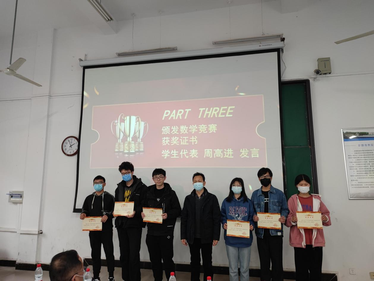 大会伊始,主持人向到场人员介绍了OK138太阳集团80名优秀选手在2021年全国大学生数学建模竞赛、全国大学生数学竞赛取得优异成绩,其中全国一等奖2项、二等奖3项、三等奖2项及省赛奖11项。据悉,本次数学竞赛我院胡苗梓等19人分别荣获数学建模竞赛和数学竞赛国家级、省部级的各级奖项。副校长蔡贤浩教授为全国大学生数学建模竞赛省部级团体获奖选手颁奖,随后OK138太阳集团党总支书记饶浪副教授为全国大学生数学竞赛国家级和省级获奖选手颁奖。