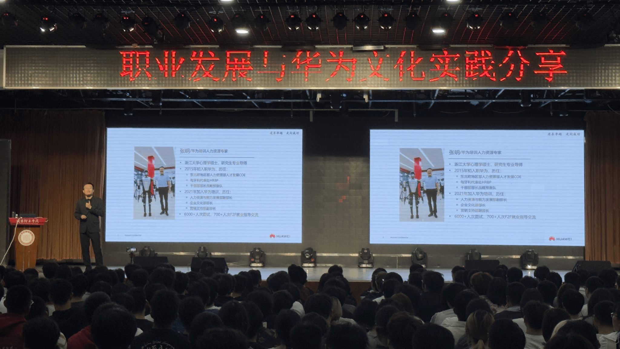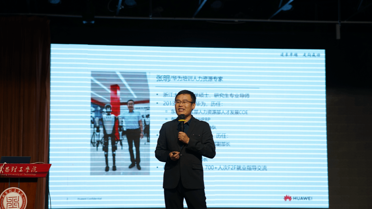讲座伊始,张明以机器人、“萝卜快跑”自动驾驶、机械手、机械狗(山猫)等前沿科技成果引入,瞬间点燃了全场对ICT(信息与通信技术)行业的探索热情。他明确了本次讲座的四大目标:打开视野洞察ICT行业未来走向、种下自我认知与职业认知的觉醒种子、探索个人职业发展方向、解读华为文化与职业发展导向。