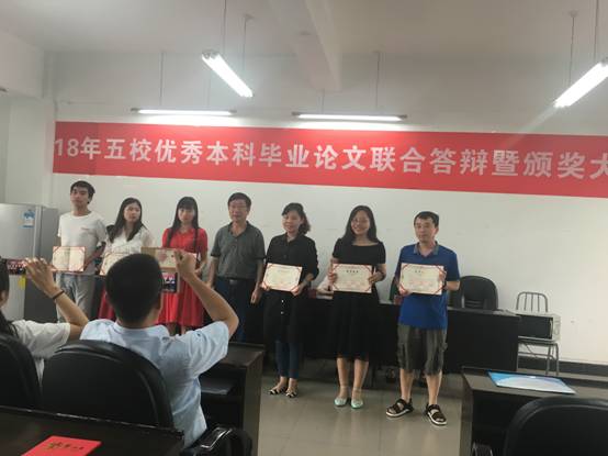 答辩结束后,评委们结合论文和答辩情况进行了优秀毕业(设计)论文的评选。本次参加五校优秀毕业(设计)论文联合答辩的同学们通过论文和答辩所展现出来的对专业基本知识、研究方法的掌握程度以及独立分析问题和解决问题的能力得到了老师们的一致认可。评委们评选出本次五校联合答辩的优秀毕业论文一、二、三等奖。同时,毕业论文获一等奖学生的指导老师被评选为优秀毕业论文指导老师。接着各位领导给获奖的学生及指导老师颁发荣誉证书,向他们表示祝贺。这是对获奖学生和相关指导老师的褒奖和鼓励。