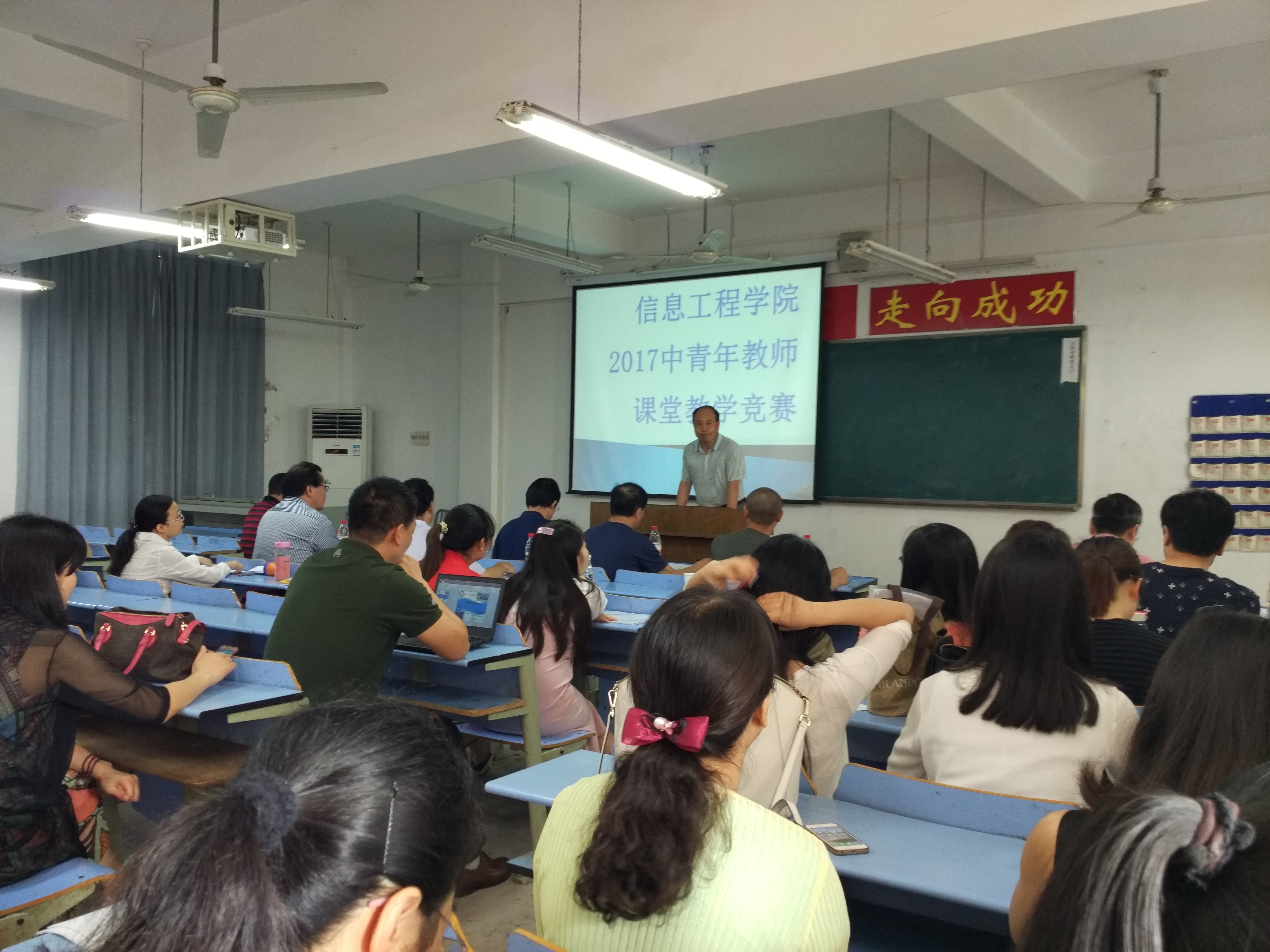 (通讯员 张红舰 报道)6月16日上午,信息工程学院在605教室举行了2017年中青年教师课堂教学竞赛。校长助理蔡贤浩教授,教务处处长李继宗教授,教学督导李正发教授,学院院长魏绍炎教授,学院副院长李强出席本次活动,学院50多位中青年教师到场观摩。
