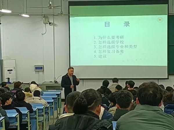 动员会上席院长结合当前考研大形势和近几年的考研数据,首先要明确为什么要考研。从科技发展的需要、个人发展的需要、服务社会的需要等几个方面阐明考研的必要性,端正考研的动机,树立考研的决心。考研一方面能够提高个人文化水平,另一方面也能够切合当今就业市场所需高科技人才的缺口,因此考研是现代教育发展的必然趋势。随后,席院长就怎样选报学校、怎样选报专业和类型、怎样复习备考以及考研建议等方面做了系统的讲解。