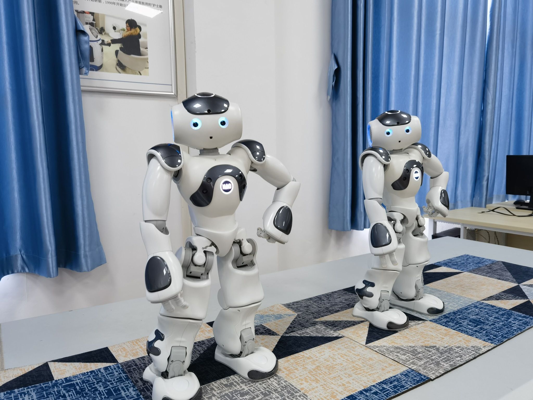 服务机器人实验室配置NAO机器人主机、NAO机器人软件、机械臂、计算机等设备。主要承担智能科学与技术、电气工程及其自动化、机械电子工程、电子信息工程、机电一体化技术等专业的《机器人技术》专业课程的实验教学任务。 实验室开设的主要实验项目:NAO 仿人机器人、仿人机器人行走在NAO平台的实践教学、仿人机器人双臂动作在NAO 平台的实践教学、力传感器在 NAO平台的实践教学、超声波传感器在NAO平台的实践教学、姿态传感器在NAO平台的实践教学、温度传感器在NAO平台的实践教学、视觉传感器在NAO平台的实践教学 、语音交互在 NAO平台的实践教学等。