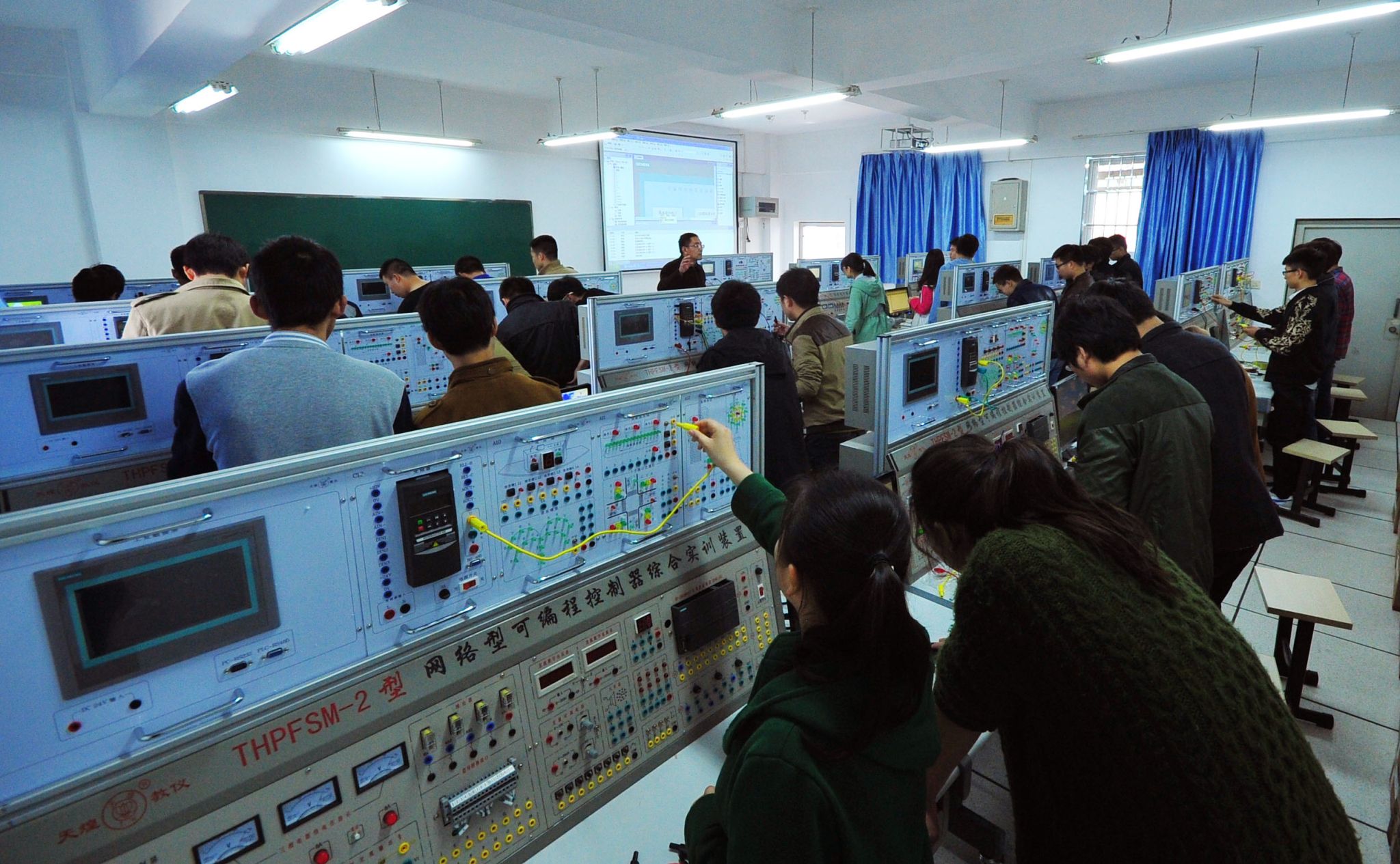 PLC实验室配置网络型可编程控制器综合实训装置THPFSM-2、THPFSM-3各15套、电脑30套等设备。主要面向电气工程及其自动化、机械电子工程、机电一体化技术等专业学生,配合《可编程控制器原理及应用》课程,开设相应实验内容。主要实验项目:典型电动机控制实操、十字路口交通灯控制、水塔水位控制、自动配料装车系统控制、电梯控制、变频器调速控制等。